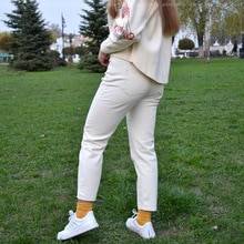 КЛАССНЫЕ ДЖИНСЫ в бело-молочном цвете ^-^ Люблю носить светлую одежду, ведь она выделяет из толпы и выглядит свежо :) Джинсы должны быть достаточно свободными, но они обтянули меня в бедрах и не сели так, как на фото продавца.. , но это было ожидаемо, потому что я смотрю и читаю отзывы, а там есть реальные фото наших девочек, где прекрасно видно, как сидят эти джинсы, так что все ок :) Цвет ближе к молочному. На мой рост 160 см длина неполная, но мне нравится эта длина, потому что я люблю разные носки и их должно быть видно =D Иногда они даже могут передать кусочек моего настроения)))) Размер выбрала 27! Меньше точно не нужно, будет туго в ногах, где бедра. Материал не тянется. Ткань плотная, но не сильно толстая, не просвечивает. Джинсы отличные, но их нужно носить с ремнем, несмотря на то, что они не спадают благодаря резинке сзади. Ремень нужен, чтобы подтянуть материал спереди и убрать тканевые складки в районе паха, ведь это смотрится не очень.. Замеры (р. 27): по краю 60 см (плюс резинка, которая тянется); по бедрам около 94 см; бедро 52-53 см; высота посадки спереди 28 см, сзади - 34см; длина по наружному шву 86 см, по внутреннему - 59 см. В общем, джинсами довольна. Смотрятся отлично! Цвет мне нравится)